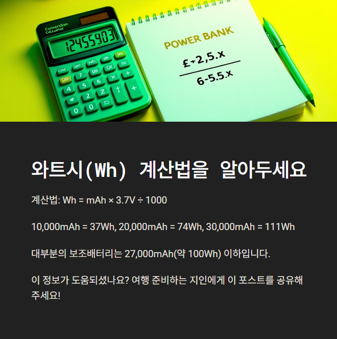 보조배터리 용량은 보통 mAh(밀리암페어시)로 표기되어 있지만, 항공 규정은 Wh(와트시)를 기준으로 해요.