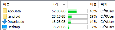 많은 애플리케이션은 사용자의 데이터나 설정을 저장하기 위해 \Users\사용자\AppData 폴더를 활용합니다. 이러한 애플리케이션은 종종 캐시 파일을 생성하여 실행 시간을 단축하거나 데이터 접근을 최적화합니다. 이러한 캐시 파일은 시간이 지남에 따라 쌓일 수 있으며, 이는 AppData 폴더의 용량을 늘리는 원인이 됩니다. 위의 사진도 보시면 가장 많은 용량을 차지하는 게 AppData인걸 확인할 수 있습니다. - 로그 파일