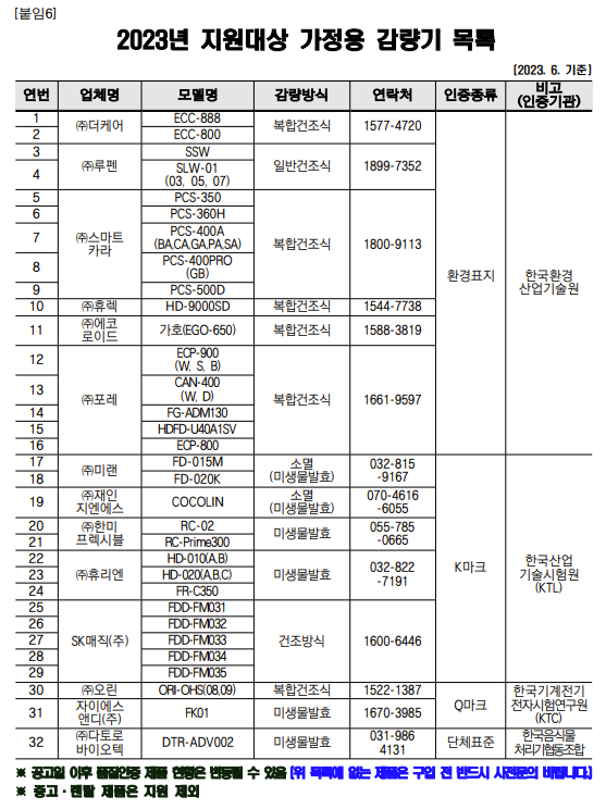 아래는 2023년 기준 지원대상 음식물 처리기 목록입니다.